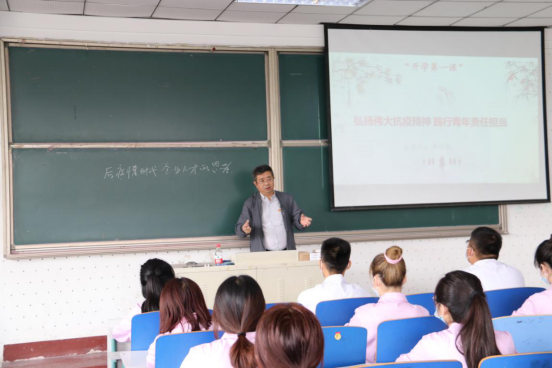 课堂上,学院领导分别与2019级医学美容技术(中医美容技术)专业4班、药学专业2班、护理专业10班、康复治疗技术专业4班学生,分享抗击疫情过程中的鲜活事例和先进典型,生动阐释了生命的意义、团结的珍贵和担当的力量,引导学生感悟疫情防控中的中国力量、中国精神以及中华民族同舟共济、守望相助的家国情怀,勉励学生做胸有大志、心有大我、肩有大任、行有大德的新时代青年,用担当书写时代画卷。或激情昂扬、或娓娓道来的讲授点燃了学生的爱国之情和报国之志。授课结束后,学生们报以热烈掌声,激动的心情久久不能平静,纷纷表示要向奔赴抗疫一线的学长学姐们学习,学好本领,用青春奋斗担当起民族复兴的历史使命和时代责任。(文/于丽萍、图/朱金融 朱克非 温兆林 陈艳华)