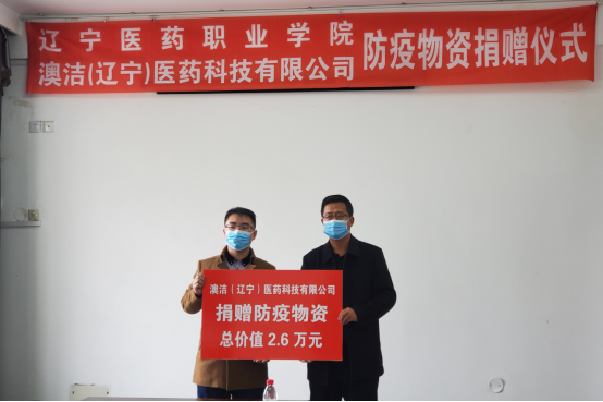 澳洁(辽宁)医药科技有限公司成立于2016年,从事药品、消毒剂、卫生用品等的生产销售,此次疫情期间勇担社会责任,为学院捐赠防疫物资,助力学院疫情防控,守护师生健康安全,为师生顺利返校复课复学提供有力的保障。(文、图/周利)
