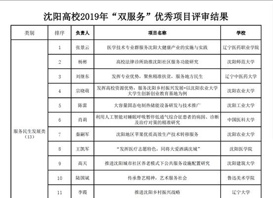 近日,沈阳市委教科工委组织开展“双服务”优秀项目服务沈阳先进集体、先进个人评选表彰工作,学院获批立项的5个项目顺利结项。其中,医学技术系张景云教授负责的《医学技术专业群服务沈阳大健康产业的实施与实践》项目获得服务民生发展类优秀项目。