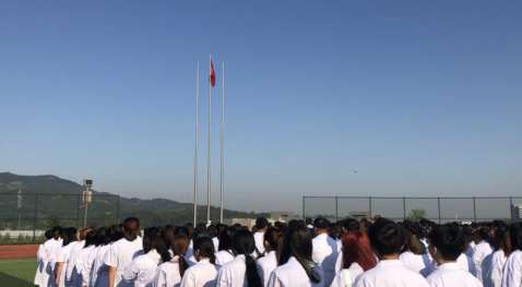 在雄壮的国歌声中,五星红旗冉冉升起,迎风飘扬。在场师生向国旗行注目礼,同唱国歌,爱国情感在每个人心中升腾。