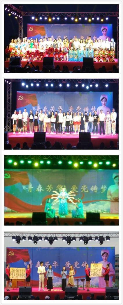 晚会分为上下篇,上篇以爱党为主题,向建党96周年献礼,诗朗诵《少年中国说》和《敢为天下先》悠扬的旋律、形神兼备的书画、慷慨激昂的演讲以及飘逸的水袖将中华情、爱国情、拥军情淋漓尽致的呈现在观众面前。歌曲《映山红》和《红旗飘飘》激昂的旋律唱响了每个人的爱国之情。下篇以青春为主题,小品《友艾 友爱》、《陌生来电》诙谐幽默,爆笑全场,同时也提高了学生对艾滋病和网络诈骗的认识。晚会还邀请沈阳药科大学的pud舞团,带来了动感十足的爵士舞串烧。晚会在学生会舞蹈《再见,不再见》中落下了帷幕,学生沉浸在热烈的氛围与青春感怀中,久久不愿离去。(文、图/柴月)