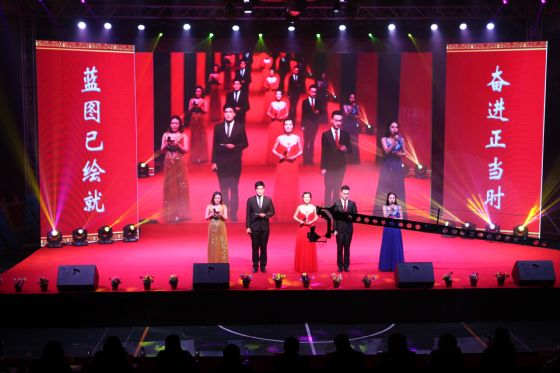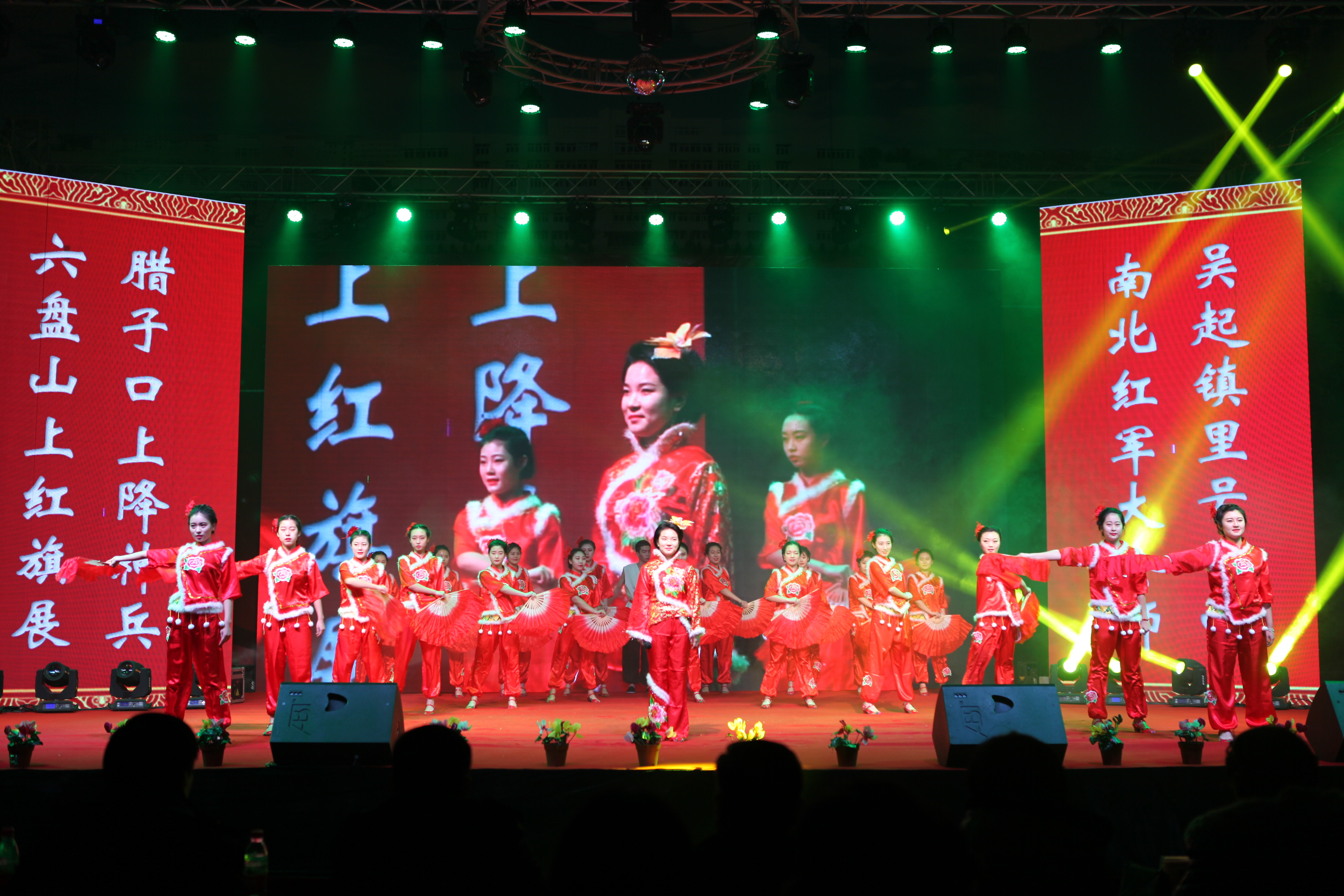 当天,文体馆内灯光璀璨,舞台以鲜红的党旗为背景,LED屏幕上“长征永远在路上”七个金色大字熠熠生辉,舞台两侧“蓝图已绘就,奋进正当时”标语催人振奋。