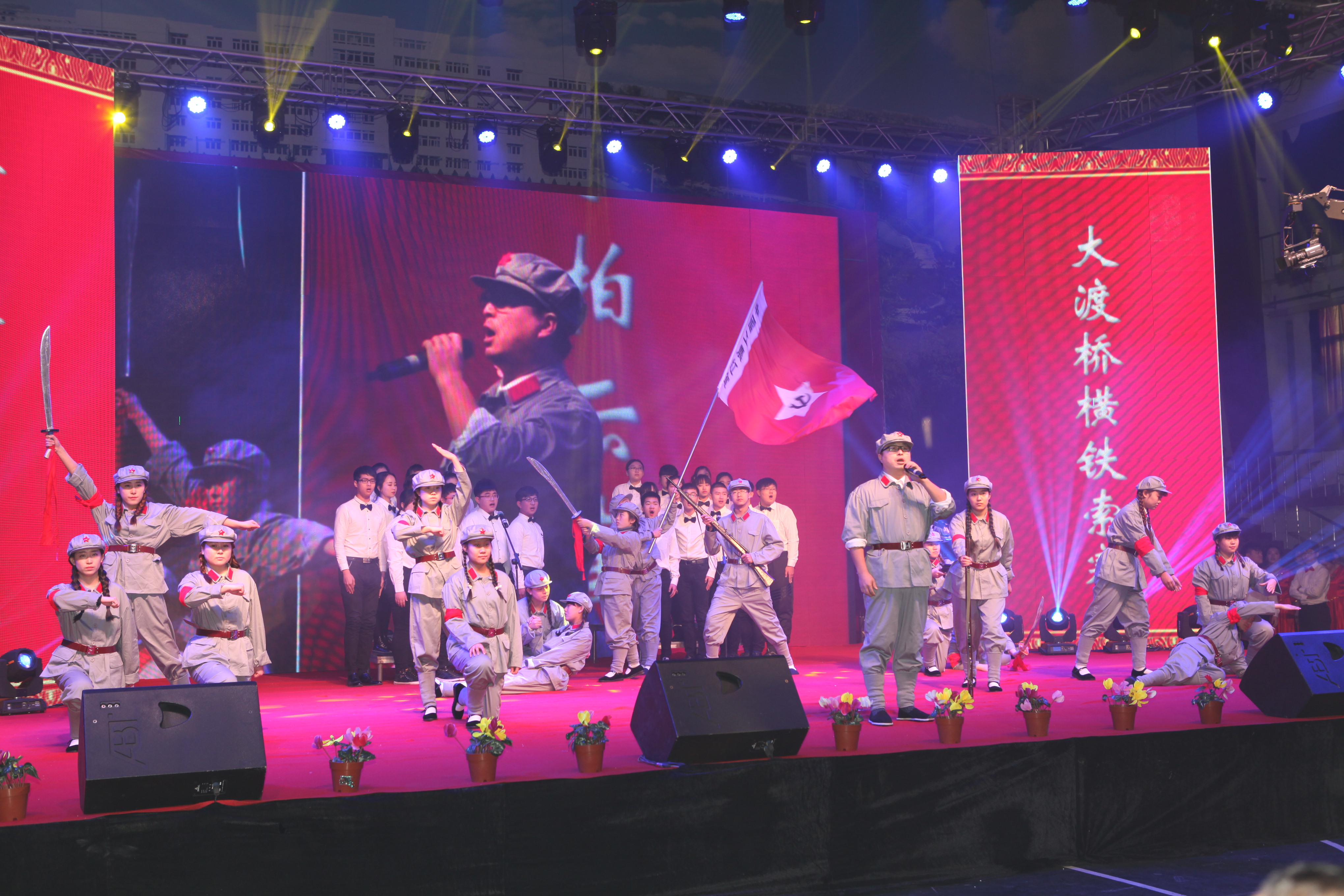 演出在绚丽的舞蹈《国歌响起》中拉开帷幕,整场演出综合运用音乐、舞蹈、情景表演、多媒体等舞台手段,共分为井冈山出发、力排险阻、光辉历程、胜利会师与展望未来五个篇章,突出表现红军将士在长征途中浴血奋战、克服艰难险阻的战斗生活,反映了中国共产党人坚定的理想信念、敢于牺牲的革命精神,凸显了中国共产党挽救民族危难的历史担当和引领民族复兴的中流砥柱作用。演出节目既有教师表演的散文诗朗诵《铭记》、《过雪山草地》、舞蹈《万泉河水清又清》、情景诗朗诵《丰碑》,又有师生同台表演的朗诵合唱《红军不怕远征难》、情景演唱《红军渡 长征源》、情景表演《十送红军》、歌曲《绣红旗》。师生同台演绎,现场高潮迭起,一首首歌曲昂扬向上,一段段舞蹈热情洋溢。在全体师生齐声高唱院歌声中,演出圆满落下了帷幕。(文/于丽萍、图/朱克非)