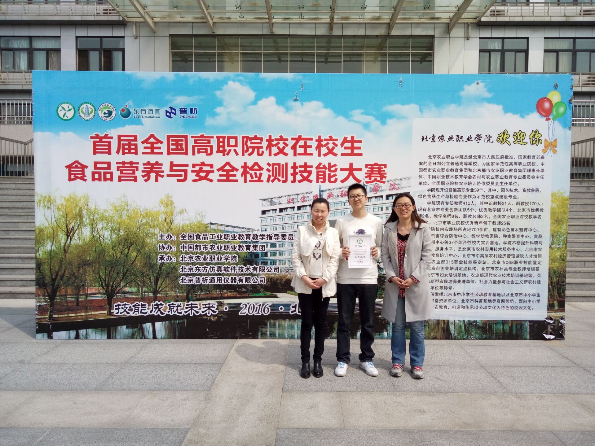 4月22—25日,首届全国高职院校在校生食品营养与安全检测技能大赛在北京农业职业学院举行。我院医学技术系医学生物技术专业任鹏同学在赛中表现优异,荣获“优秀选手”称号。